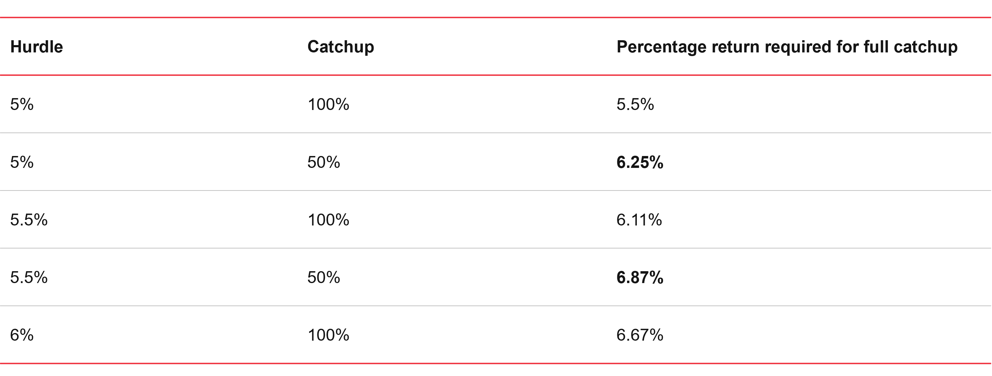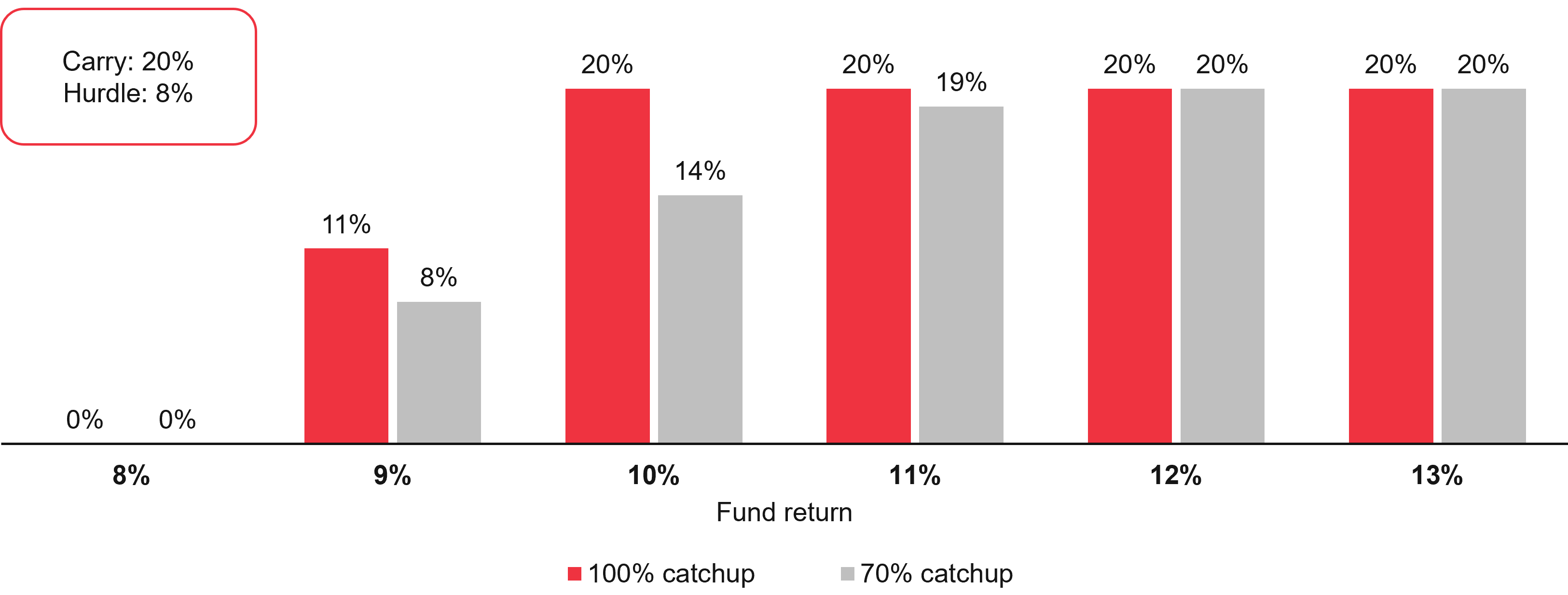By lowering the catchup to 50%, rather than increasing the hurdle by 50 basis points, the GP starts participating in the profits earlier, but only reaches the agreed carried percentage later when compared to a higher hurdle where the catchup is kept at 100%.