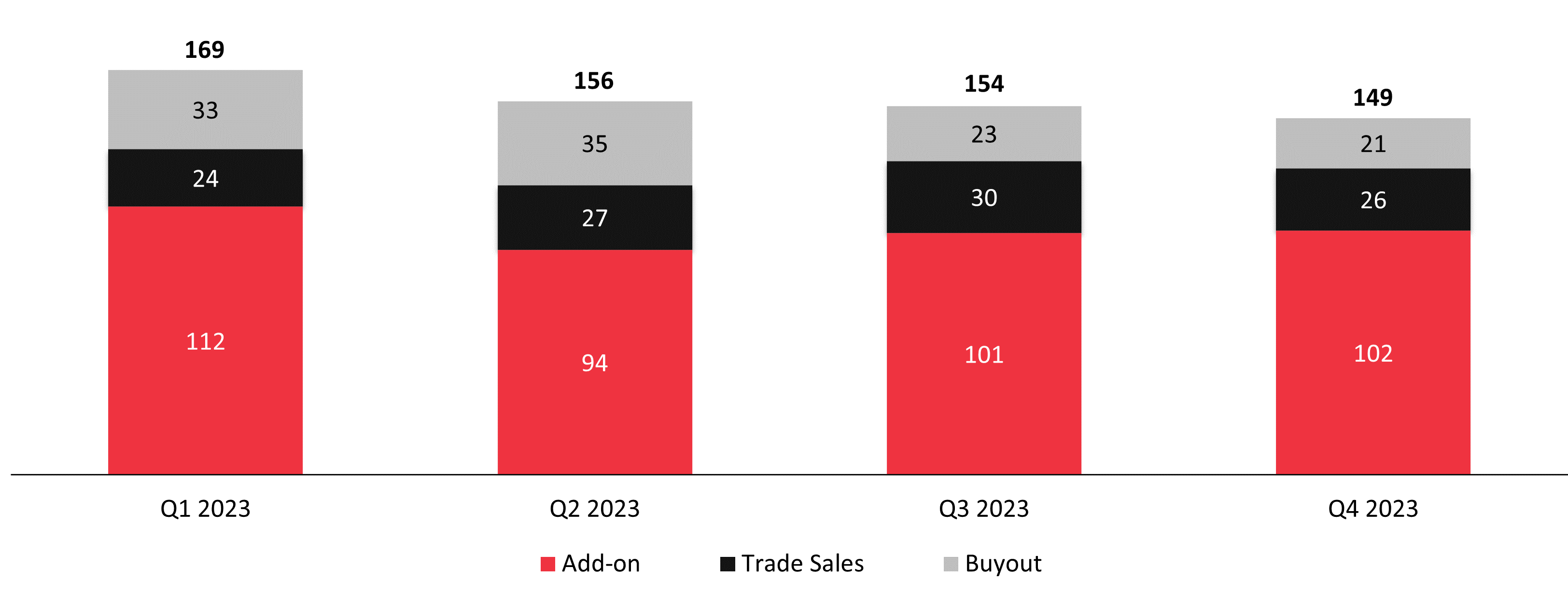 Private equity houses have been extending their investment holding periods and pursuing bolton acquisitions to generate further value. Bolt-ons have been the most popular deal type over the last year accounting for 43% of activity, followed by buyouts at 12% and trade sales at 11%.7 Trade buyers that built up strong cash reserves over recent years have taken advantage of the less competitive acquisition market of 2023 and have been able to take a strategic long-term view to investments. As trade buyers tend to not rely as heavily on debt to finance their transactions, they have been less encumbered by unfavourable debt markets. This has led to trade sales being one of the more popular exit routes for private equity.