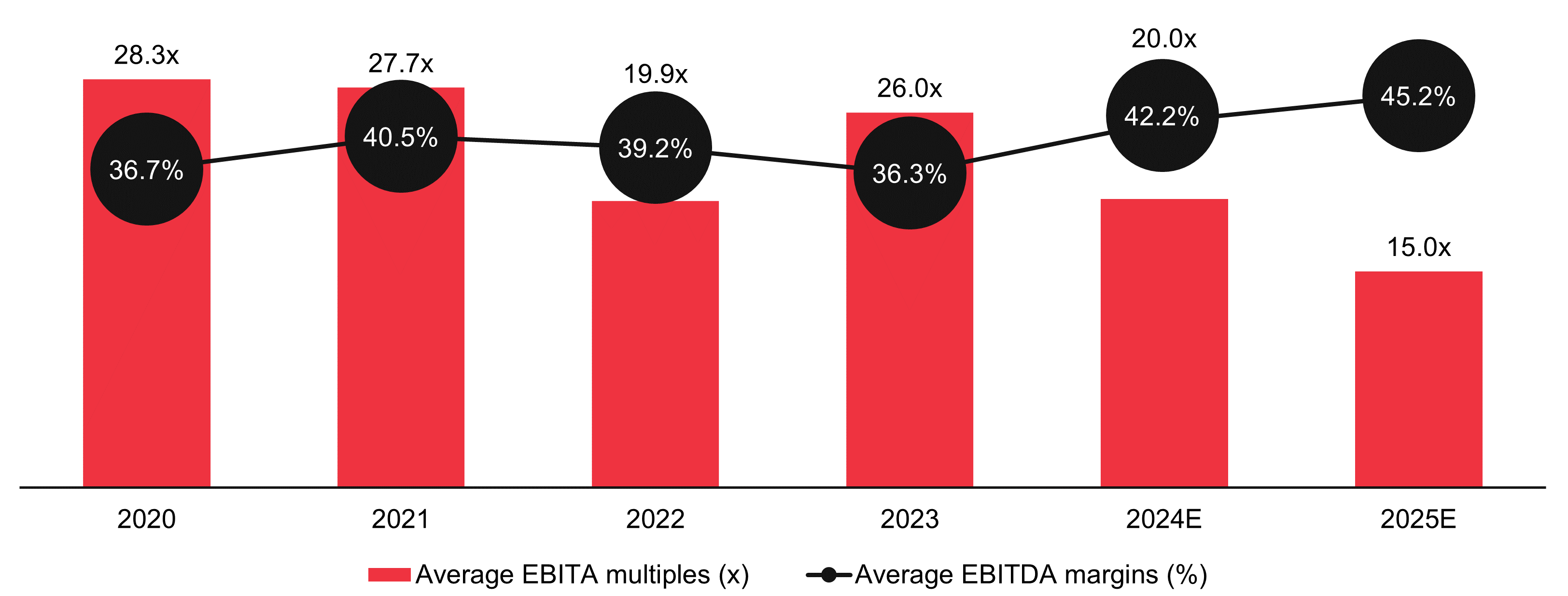 AI companies rely on the advanced chips produced by semiconductor manufacturers to develop their products. The legal and governance controversies surrounding AI, combined with trade tensions, 5G rollout delays and weak consumer confidence, have led to a slowdown in the semiconductor sector in 2023. Many of the big players saw their revenue and EBITDA decline, with the notable exception of Nvidia. The high EV/EBITDA multiples seen between 2020-2023 (excluding 2022 due to the impact of the Russia-Ukraine crisis on supply chains) may be explained by the expectations of exponential future growth from the substantial investments into the sector on the back of the AI boom. As the growth curve begins to flatten in 2024 and 2025, the EBITDA and enterprise value growth rates for the market leaders are expected to stabilise, resulting in a moderation of multiples.