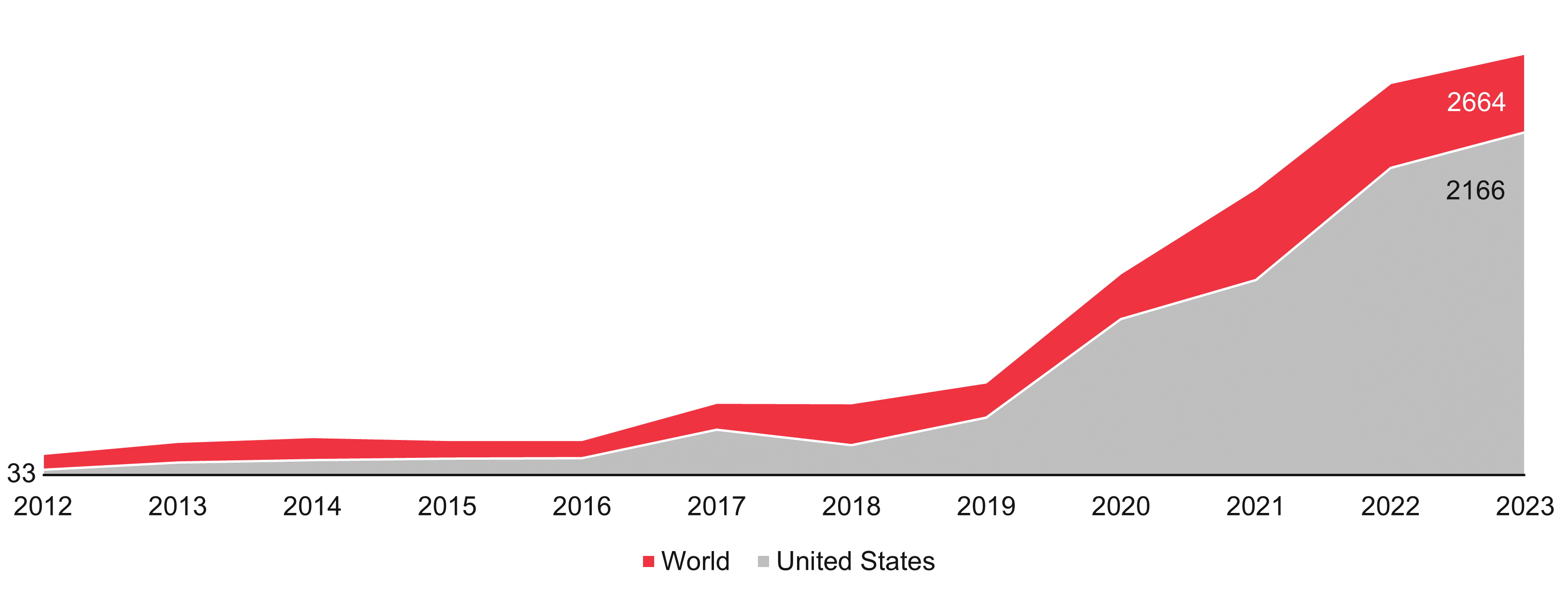 Nvidia, the leading producer of graphical processing units (GPUs) for AI applications, saw its share price skyrocket by 240%.16 The company benefitted from the influx of $27bn17 into generative AI start-ups, which use AI to create new content such as text, images and music. One of the most successful AI products of 2023 was ChatGPT, a chatbot that attracted over 100 million users in less than two months, setting a new record for consumer adoption.18 However, the rapid growth of AI also sparked legal and ethical challenges, as some of the generative AI start-ups faced lawsuits and regulatory scrutiny for potentially infringing on copyrights and violating privacy. For example, Universal Music sued Amazon-backed Anthropic19 and the New York Times sued OpenAI20, one of the most prominent AI research organizations. OpenAI also suffered from internal turmoil, as its CEO, Sam Altman, was briefly ousted and then reinstated after a revolt by hundreds of its employees.21